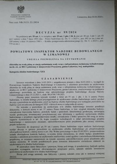 Powiatowy Inspektorat Nadzoru Budowlanego wydał decyzję zezwalającą na użytkownie zbiornika na wodę pitną w miejscowości Przyszowa.