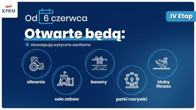 Od 30 maja br. zostaje wprowadzony IV etap znoszenia obostrzeń związanych z COVID-19. Od 6 czerwca działalność mogą wznowić w określonych warunkach sanitarnych: kina, teatry, opery, balet, baseny, siłownie, kluby fitness, sale zabaw i parki rozrywki.