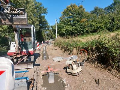 Wójt Gminy Bogdan Łuczkowski wspólnie z Sekretarzem Januszem Bieńkiem sprawdził postęp prac przy budowie chodnika obok Szkoły Podstawowej nr 2 w Przyszowej. Prace obecnie polegają na ułożeniu obrzeży chodnika i przygotowaniu terenu pod dalsze ułożenie kostki brukowej.