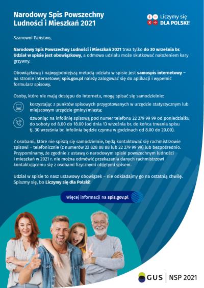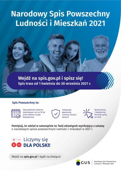 Nadal 16 % mieszkańców z naszej gminy nie wypełniło obowiązku spisowego. Narodowy Spis Powszechny Ludności i Mieszkań 2021 trwa tylko do 30 września br. Obowiązkową i najwygodniejszą metodą udziału w spisie jest samospis internetowy – na stronie internetowej spis.gov.pl należy zalogować się do aplikacji i wypełnić formularz spisowy.