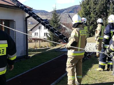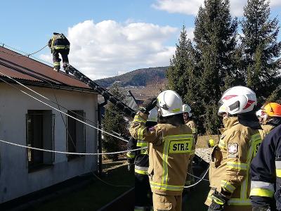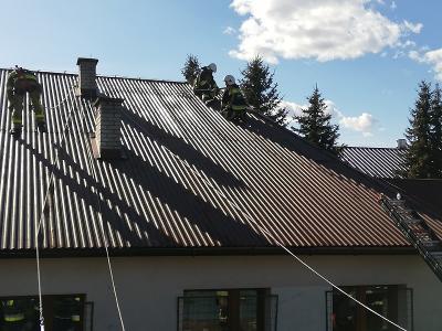 W dniu 19.02.2022 r (sobota godziny południowe) na dachu budynku Szkoły Podstawowej w Stroniu niezbędna była pomoc straży pożarnej. W czasie porywistego wiatru na narożnych i brzegowych rejonach dachu oddziału przedszkolnego zostały obluzowane śruby na krokwiach, co groziło podniesieniem blachy i zerwaniem całej konstrukcji.
