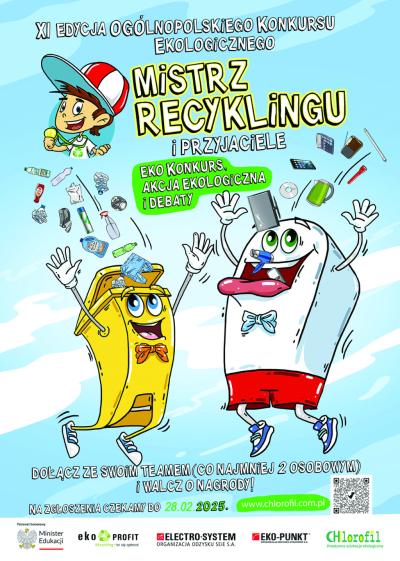 02.02.2025 r. rusza XI edycja ogólnopolskiego konkursu ekologicznego pt: „Mistrz Recyklingu i Przyjaciele”. Konkurs skierowany jest do uczniów szkół podstawowych i jest formą edukacji ekologicznej. Przedmiotem konkursu jest wykonanie instrukcji, określenie reguł gry i wykonanie makiety, pionków, kostek czy kart do gry planszowej nt. recyklingu, a także prezentacja tej gry innym uczniom w placówce edukacyjnej i przesłanie do organizatora dokumentacji zdjęciowej. W konkursie mogą wziąć udział ekozespoły co najmniej 2 osobowe z klas 1-8. Na koncepcje gier planszowych czekamy do 15.03.2025 r. Nagrody to wyjazdy integracyjne dla najlepszych ekozespołów o tematyce przyrodniczej i ekologicznej.