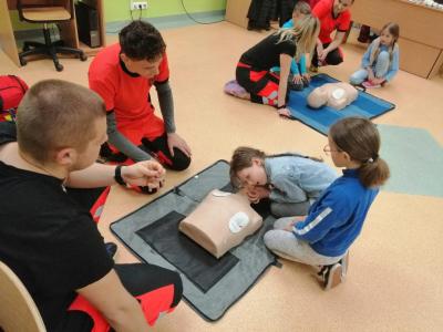 Uczniowie mieli okazję zdobyć wiedzę z zakresu: podstawowych działań resuscytacyjnych, udzielania pierwszej pomocy, w tym również w przypadku zakrztuszeń u dzieci i dorosłych, poznali sposób ułożenia poszkodowanego w pozycji bocznej bezpiecznej oraz możliwość pomocy choremu z napadem drgawkowym. Uczestnicy z uwagą oglądali pokaz wykonany przez studentów oraz bardzo chętnie uczestniczyli w ćwiczeniach i znakomicie poradzili sobie z powierzonymi im zadaniami.