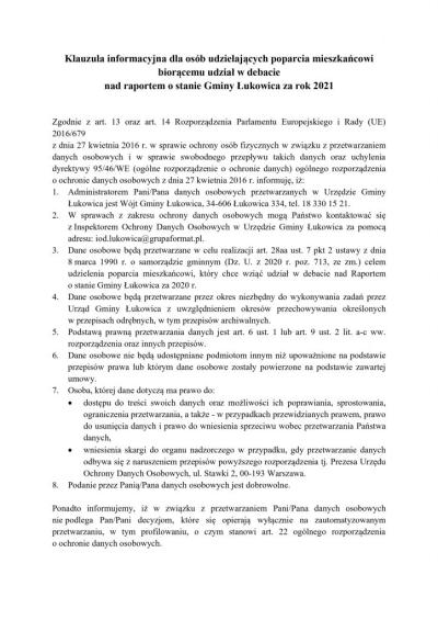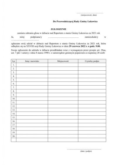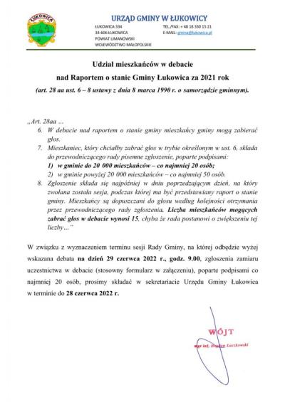 Debata nad raportem o stanie Gminy Łukowica 13.06.2022 21:47 Treść Zapraszamy mieszkańców do debaty nad raportem o stanie Gminy Łukowica za 2021 rok. Dokumenty potrzebne do udziału w debacie Pobierz Raport o stanie Gminy Łukowica za rok 2021 Email Drukuj