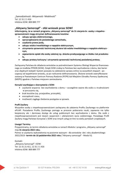 Do 31 sierpnia 2022 r. można składać wnioski o dofinansowanie w ramach likwidacji barier w programie „Aktywny Samorząd” Moduł I, w którym skorzystać można min. z dofinansowania do zakupu sprzętu elektronicznego, specjalistycznego oprogramowania czy szkoleń w zakresie obsługi. Więcej informacji na stronie: pfron.org.pl