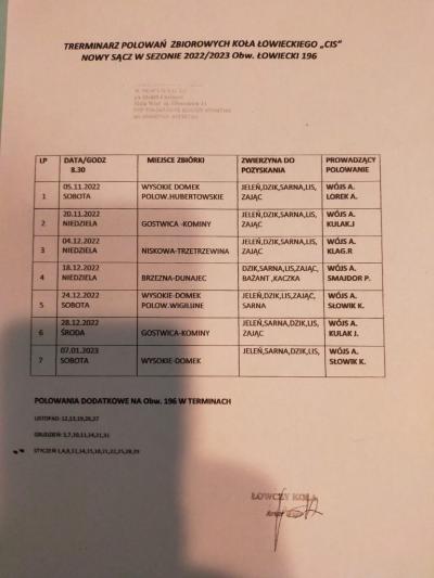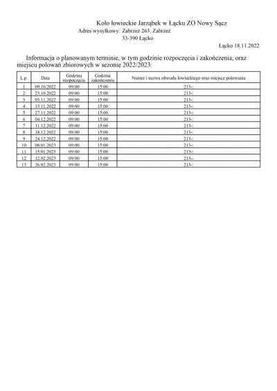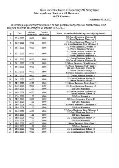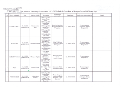 Terminy polowań Kół Łowieckich 18.11.2022 21:16 Treść Zachęcamy do zapoznania się z terminami polowań Kół Łowieckich: „Cis”, „Darz Bór”, „Jarząbek”, „Gorce”. Email Drukuj