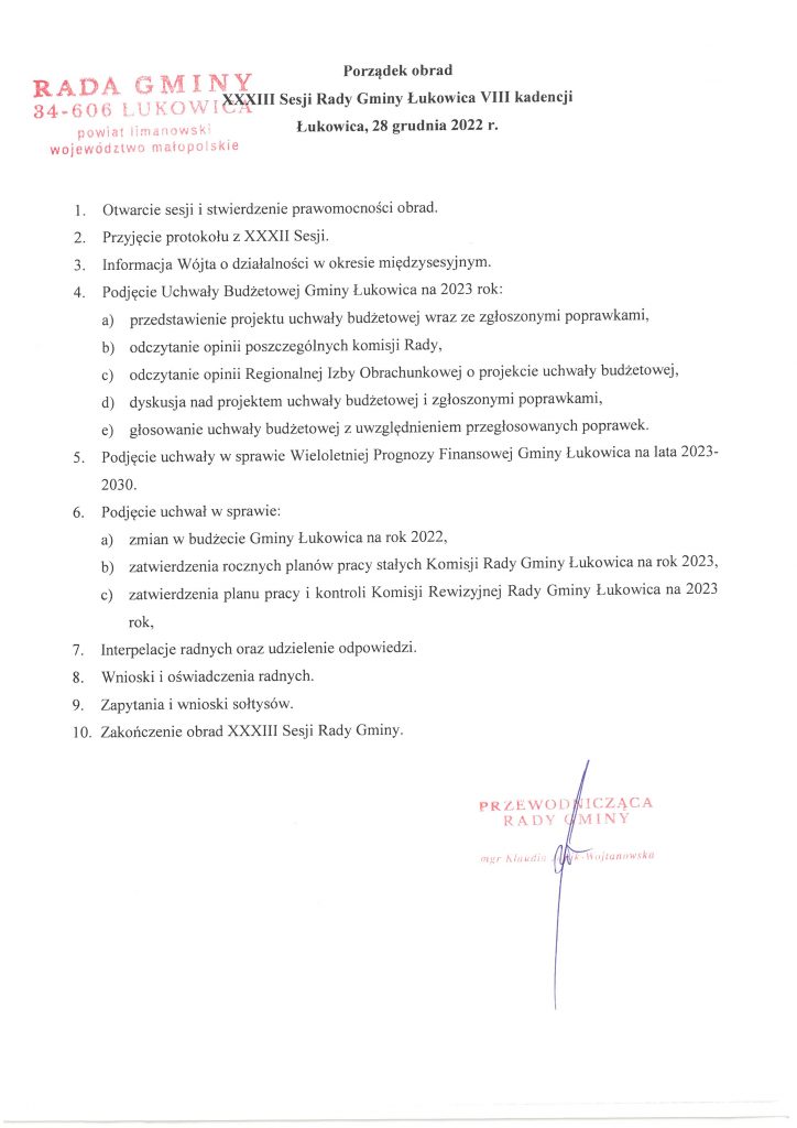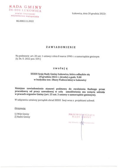 XXXIII Sesja Rady Gminy Łukowica 22.12.2022 14:45 Treść XXXIII Sesja Rady Gminy Łukowica odbędzie się w dniu 28 grudnia 2022r. (środa) o godzinie 9:00 w budynku tzw. Obory Podworskiej w Łukowicy. Email Drukuj