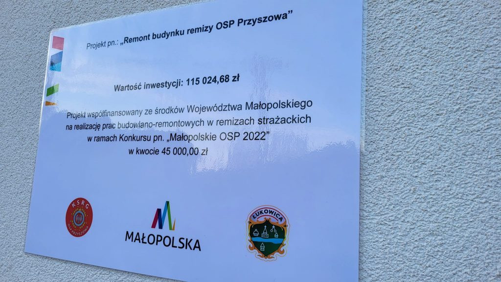Zadanie zrealizowane dzięki otrzymanemu dofinansowaniu z Urzędu Marszałkowskiego w kwocie 45 000,00 złotych w ramach programu „Małopolskie OSP 2022”. Łączna kwota zadania to 115 024,68 złotych. Wkład własny to środki z budżetu Gminy Łukowica oraz z Funduszu Sołeckiego Sołectw Przyszowa I i Przyszowa II