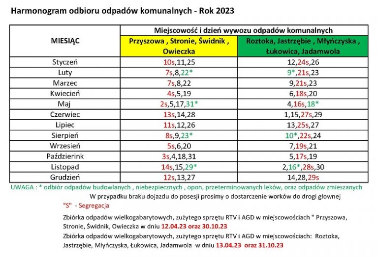 Harmonogram odbioru odpadów komunalnych w roku 2023