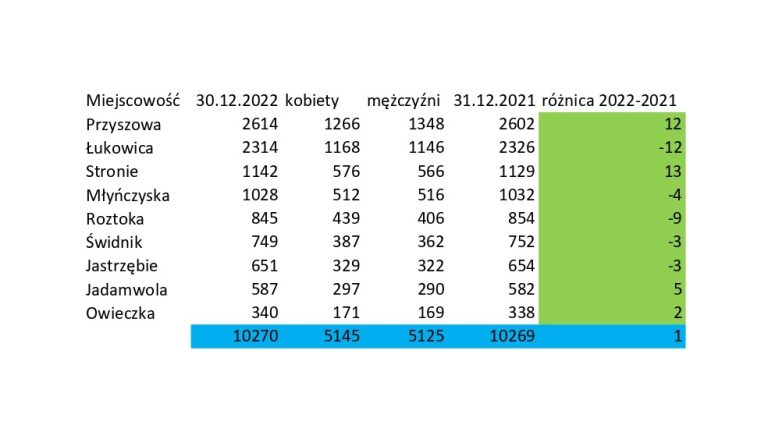 W 2022 roku zmarło 105 osób z naszej Gminy. 58 mężczyzn i 47 kobiet. Najwięcej w Przyszowej – 27, Łukowicy 22 i Stroniu – 16. Najmniej w Jadamwoli – 3, Owieczce – 5 i Jastrzębiu – 6.