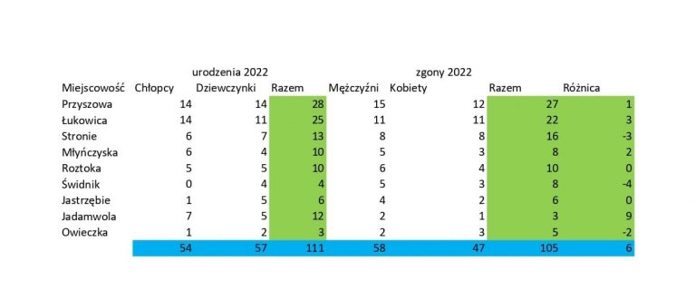 W kończącym roku urodziło się w naszej gminie 111 dzieci, 57 dziewczynek i 54 chłopców. Najwięcej w dwóch największych miejscowościach, w Przyszowej 28 dzieci a w Łukowicy 25. Kolejno Stronie 13 i Jadamwola 12 w Roztoce i Młyńczyskach po 10, Jastrzębie 6, Świdniku 4 a Owieczce 3.