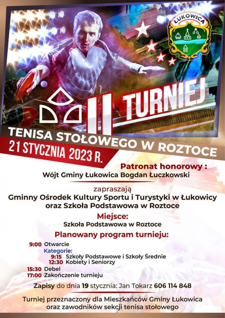 21 stycznia 2023 r. w Szkole Podstawowej w Roztoce o godzinie 9:00 odbędzie się II Turniej Tenisa Stołowego pod Patronatem honorowym Wójta Gminy Łukowica – Bogdana Łuczkowskiego.