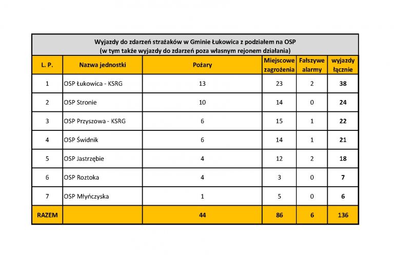 Wyjazdy strażaków do zdarzeń w Gminie Łukowica w 2022 roku 03.01.2023 15:09 Treść Przedstawiamy wyjazdy do zdarzeń strażaków w Gminie Łukowica z podziałem na OSP w 2022 roku (w tym także wyjazdy do zdarzeń poza własnym rejonem działania). Email Drukuj