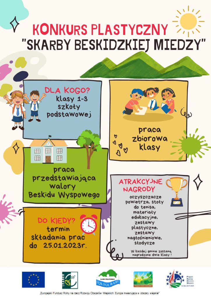 Stowarzyszenie Lokalna Grupa Działania „Przyjazna Ziemia Limanowska” wraz z Stowarzyszeniem Lokalna Grupa Działania „Dolina Raby” ogłasza konkurs plastyczny dla szkół podstawowych w ramach realizowanego projektu współpracy „Skarby Beskidzkiej Miedzy”.