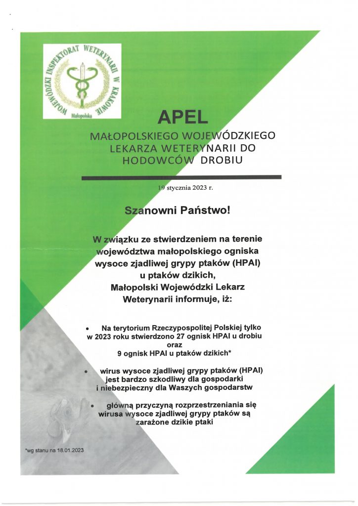 Ponadto Powiatowy Lekarz Weterynarii w Limanowej informuje, że na terytorium Rzeczypospolitej Polskiej stwierdzono dotychczas 30 ognisk wysoce zjadliwej grypy ptaków u drobiu hodowlanego (HPAI) i 9 ognisk u dzikich ptaków (stan na 20.01.2023). Należy zwrócić szczególną uwagę na fakt, że sytuacja epizootyczna związana z występowaniem grypy ptaków u drobiu i u dzikiego ptactwa stwarza ryzyko szerzenia się tej choroby na terytorium małopolski w związku z czym Powiatowy Lekarz Weterynarii w Limanowej przypomina o obowiązku zgłaszania padłych ptaków do badań w kierunku wysoce zjadliwej grypy ptaków {HPAI) oraz natychmiastowym zgłaszaniu podejrzeń wystąpienia grypy ptaków.