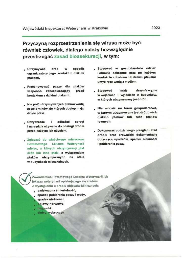 Powiatowy Lekarz Weterynarii w Limanowej w związku z wystąpieniem ogniska wysoce zjadliwej grypy paków (HPAI) u ptaków dzikich na terenie województwa małopolskiego przekazuje informacje dotyczące zasad bioasekuracji dla hodowców drobiu o konieczności zachowania szczególnej ostrożności i odpowiednich środków bioasekuracji przy obsługiwaniu drobiu, minimalizujących ryzyko przeniesienia wirusa grypy ptaków do gospodarstwa,