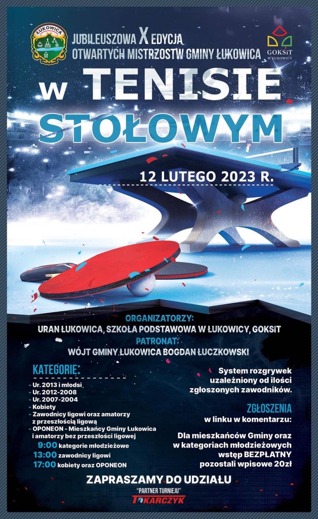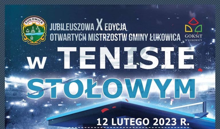 12 lutego 2023 odbędzie się jubileuszowa X edycja Otwartych Mistrzostw Gminy Łukowica w tenisie stołowym. Szczegóły dostępne na plakacie promocyjnym.
