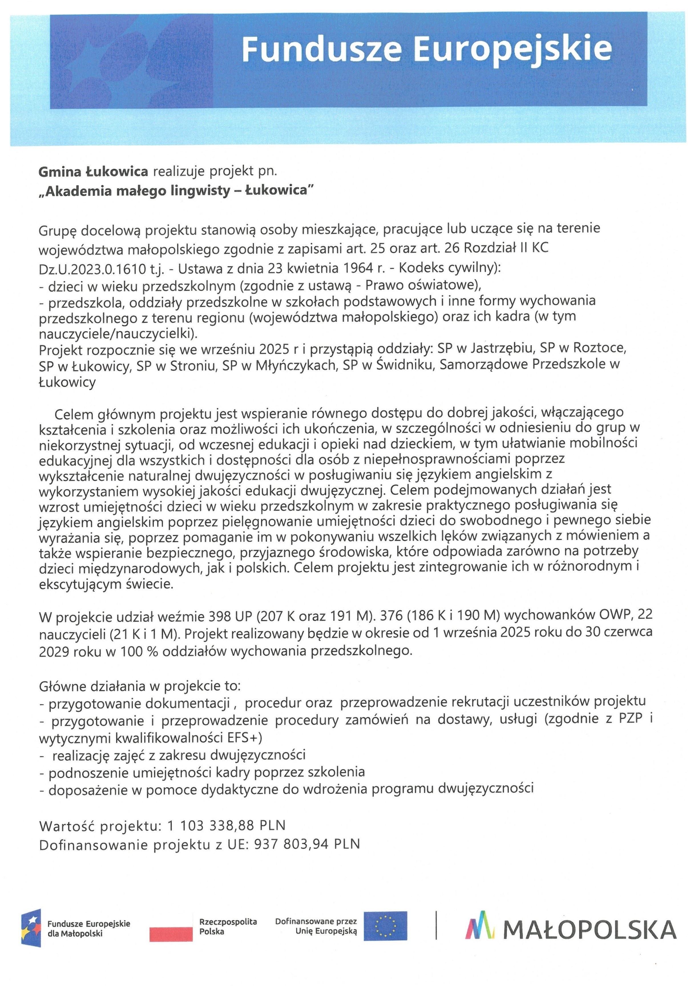 Gmina Łukowica realizuje projekt pn. „Akademia małego lingwisty – Łukowica” Grupę docelową projektu stanowią osoby mieszkające, pracujące lub uczące się na terenie województwa małopolskiego. Wartość projektu: 1 103 338,88 PLN Dofinansowanie projektu z UE: 937 803,94 PLN.