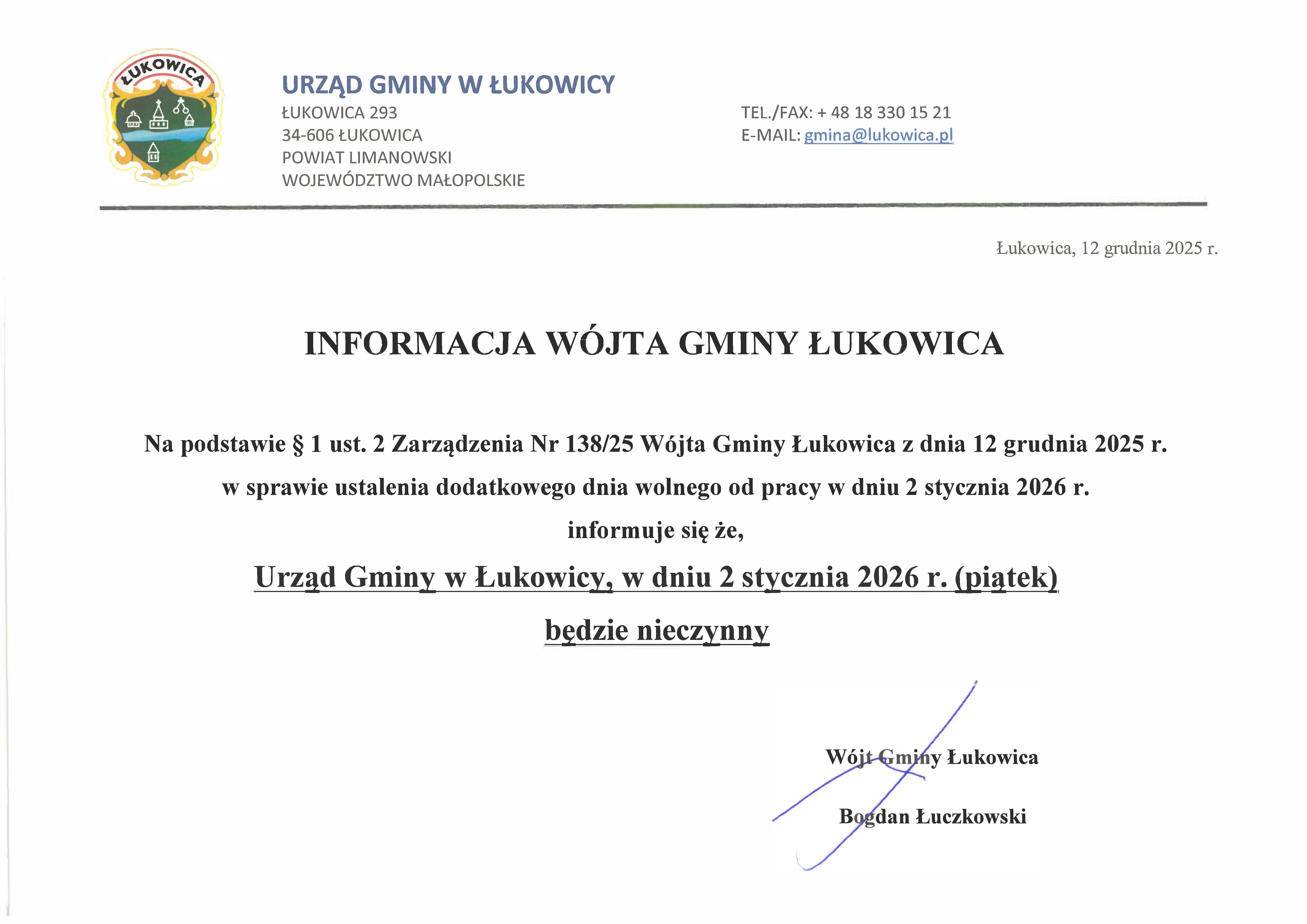 2 stycznia 2026 Urząd Gminy w Łukowicy będzie nieczynny 12.12.2025 15:34 Treść Zarządzenie dostępne na BIP Email Drukuj