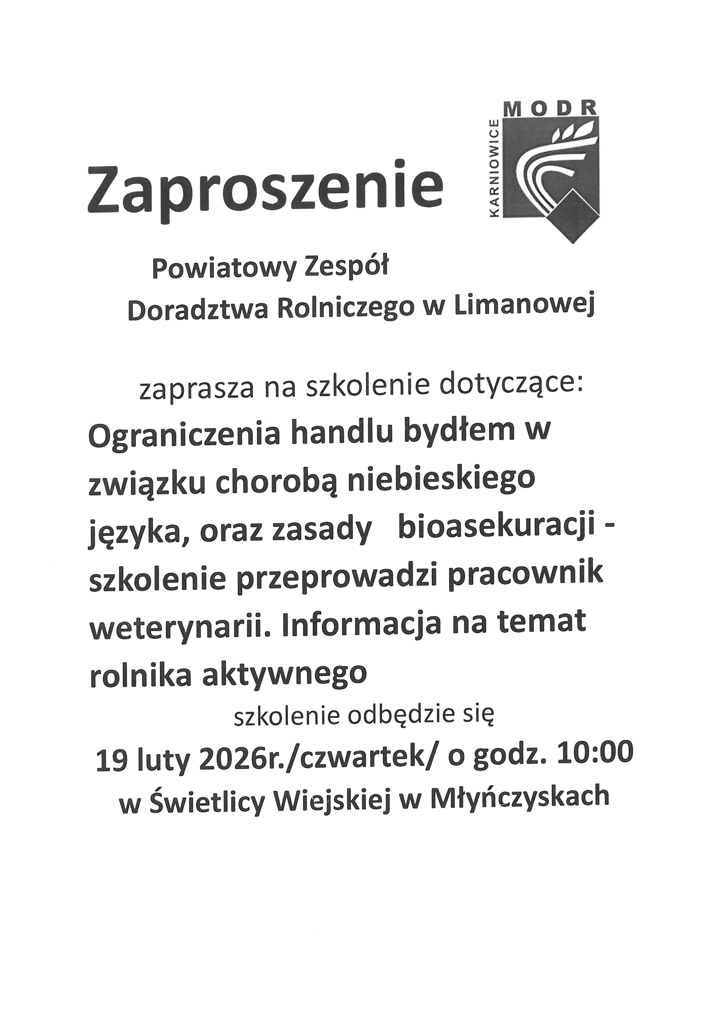 Powiatowy Zespół Doradztwa Rolniczego w Limanowej zaprasza na szkolenie rolników w dniu 19 lutego 2026r. o godzinie 10:00 w Świetlicy Wiejskiej w Młyńczyskach