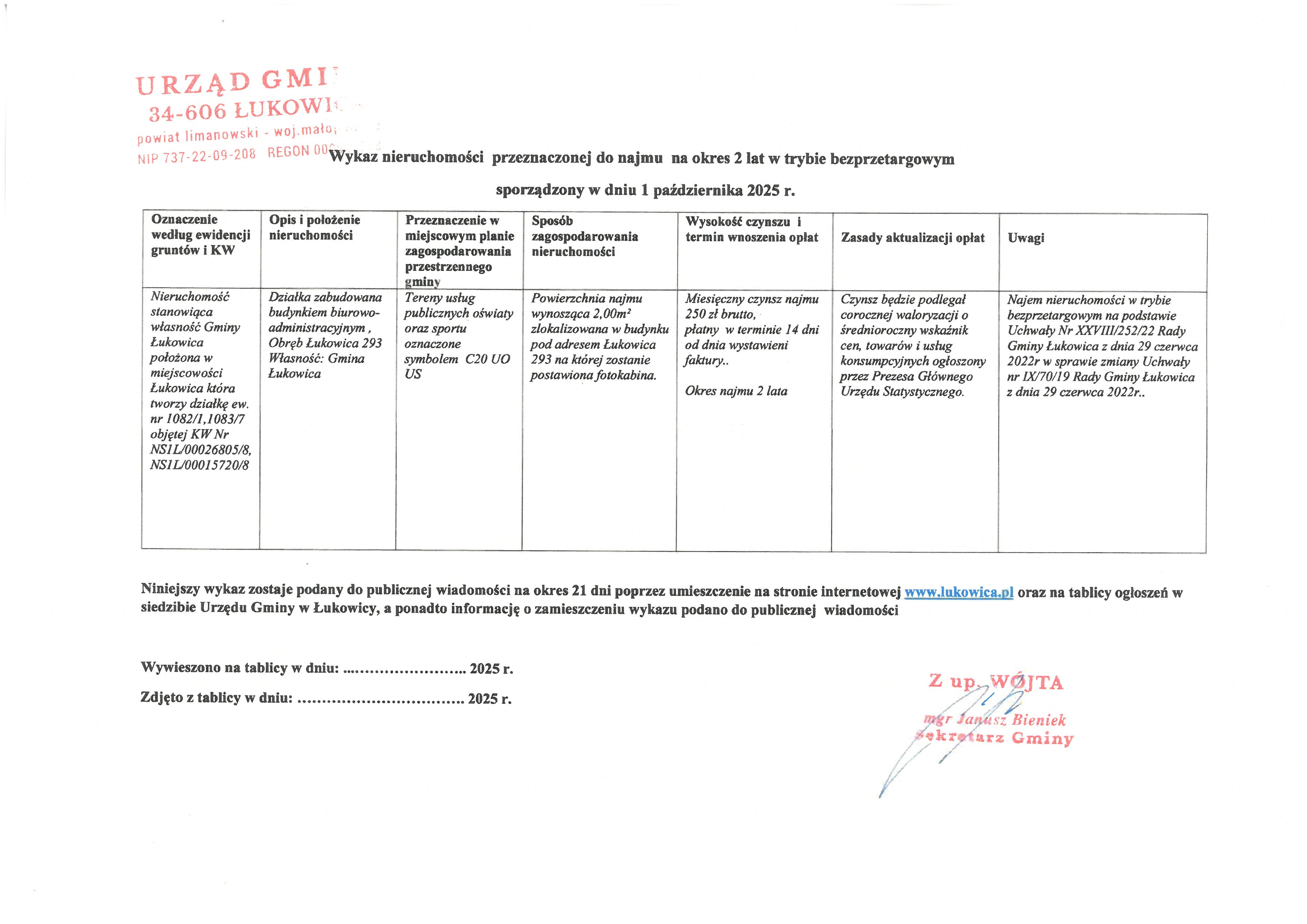Wykaz nieruchomości przeznaczonych do najmu 02.10.2025 11:49 Treść Urząd Gminy w Łukowicy informuje o wykazie nieruchomości przeznaczonych do najmu Email Drukuj
