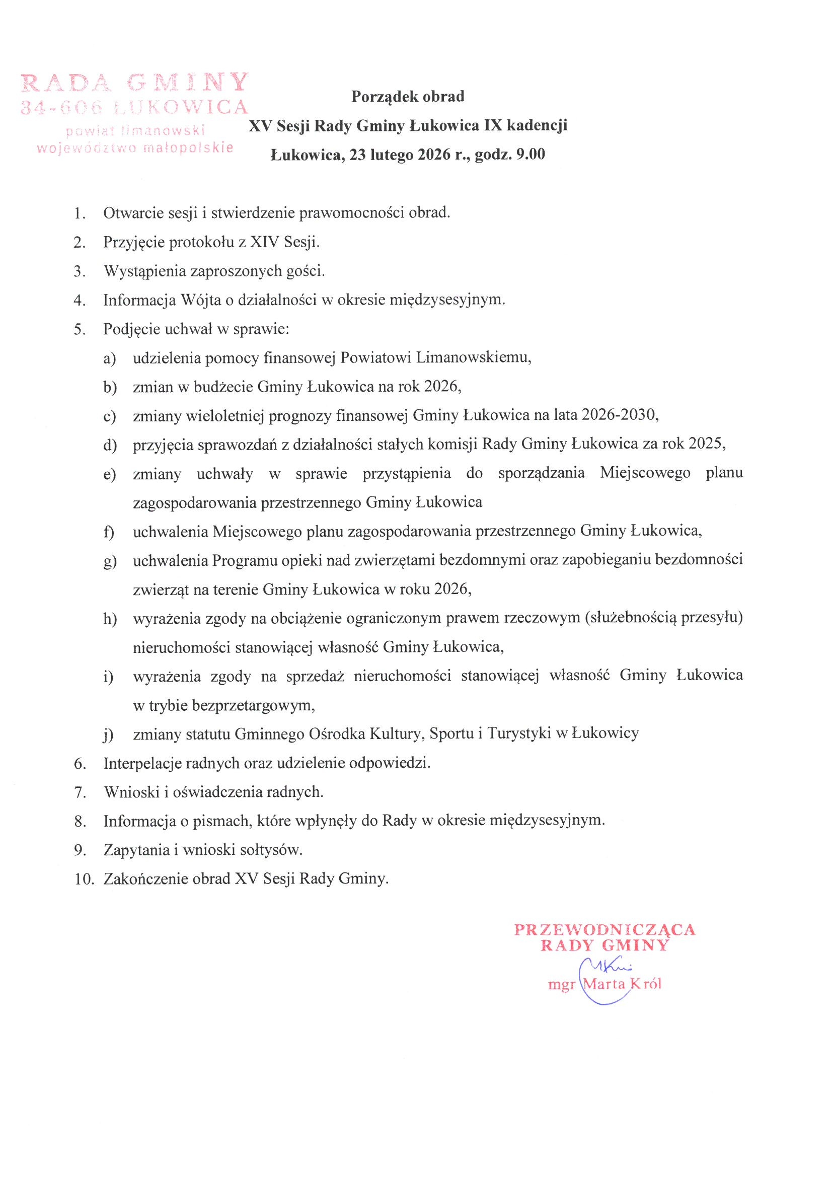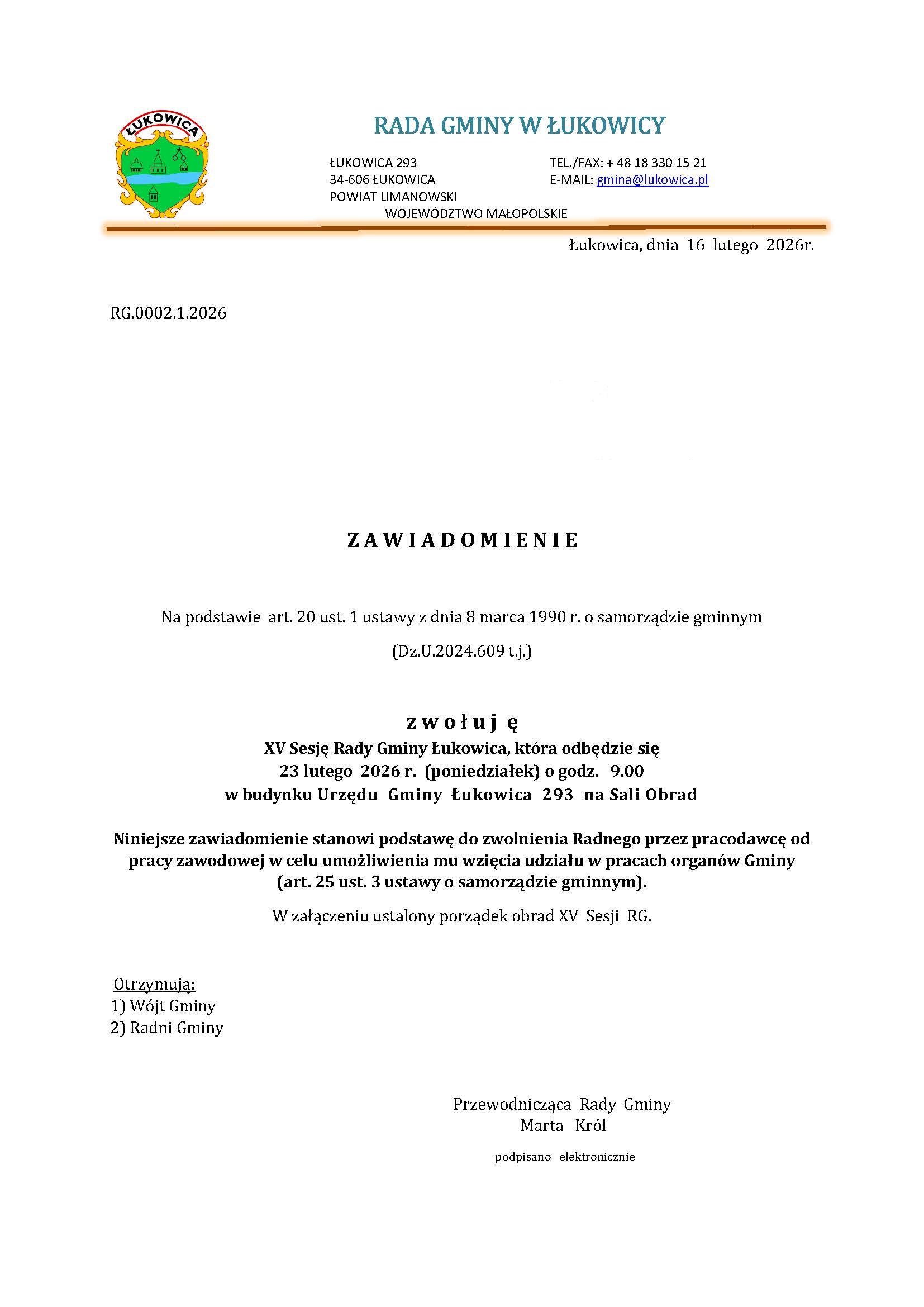 XV Sesja Rady Gminy Łukowica odbędzie się w dniu 23 lutego 2026 r. o godzinie 9:00 w budynku Urzędu Gminy Łukowica 293 na Sali Obrad