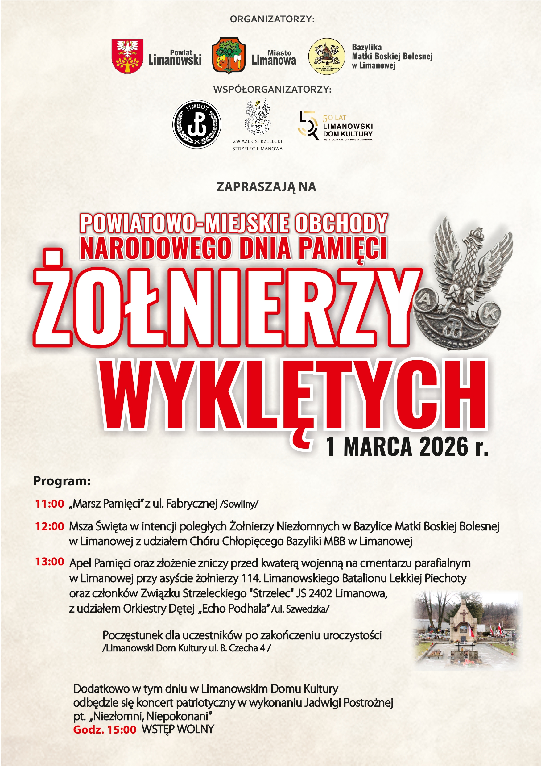 Narodowy Dzień Pamięci Żołnierzy Wyklętych - polskie święto państwowe obchodzone corocznie 1 marca, poświęcone pamięci żołnierzy antykomunistycznego i niepodległościowego podziemia. Oddając należną pamięć bohaterom minionych lat, również na terenie powiatu limanowskiego w dniu 1 marca 2025 roku odbędą się uroczystości upamiętniające Żołnierzy Wyklętych.