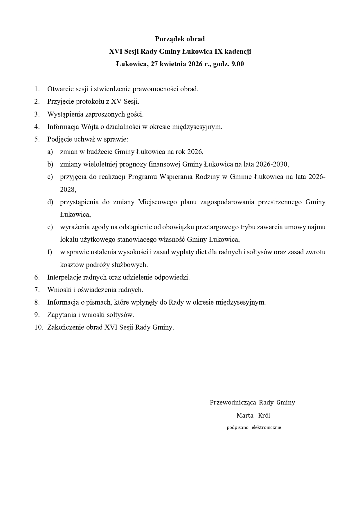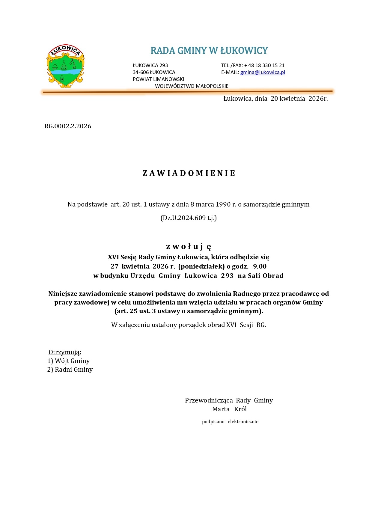 XVI Sesja Rady Gminy Łukowica, odbędzie się 27 kwietnia 2026 r. (poniedziałek) o godz. 9.00 w budynku Urzędu Gminy Łukowica 293 na Sali Obrad.