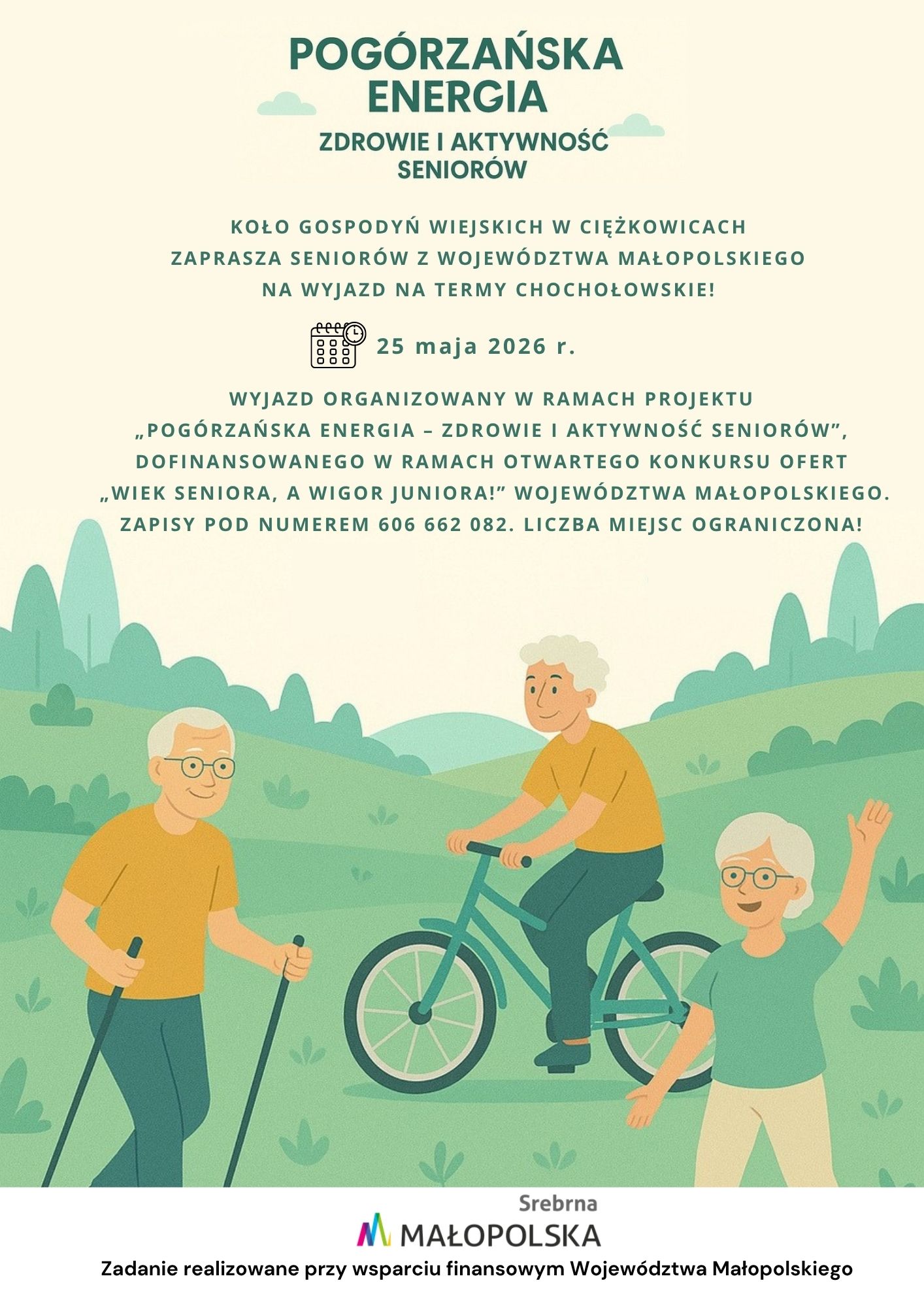 KGW w Ciężkowicach w ramach realizowanego projektu pn. "Pogórzańska Energia zdrowie i aktywność seniorów" w ramach otwartego konkursu ofert Wiek seniora a wigor juniora Województwa Małopolskiego skierowanego do wszystkich seniorów z Małopolski, zwraca się z uprzejmą prośbą o publiczne udostępnienie lub wywieszenie plakatu promocyjnego, który stanowi załącznik do niniejszej wiadomości.