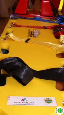 SP Stronie – zestaw ratownictwa medycznego PSP R-1 z deską ortopedyczną i szynami, defibrylator półautomatyczny;