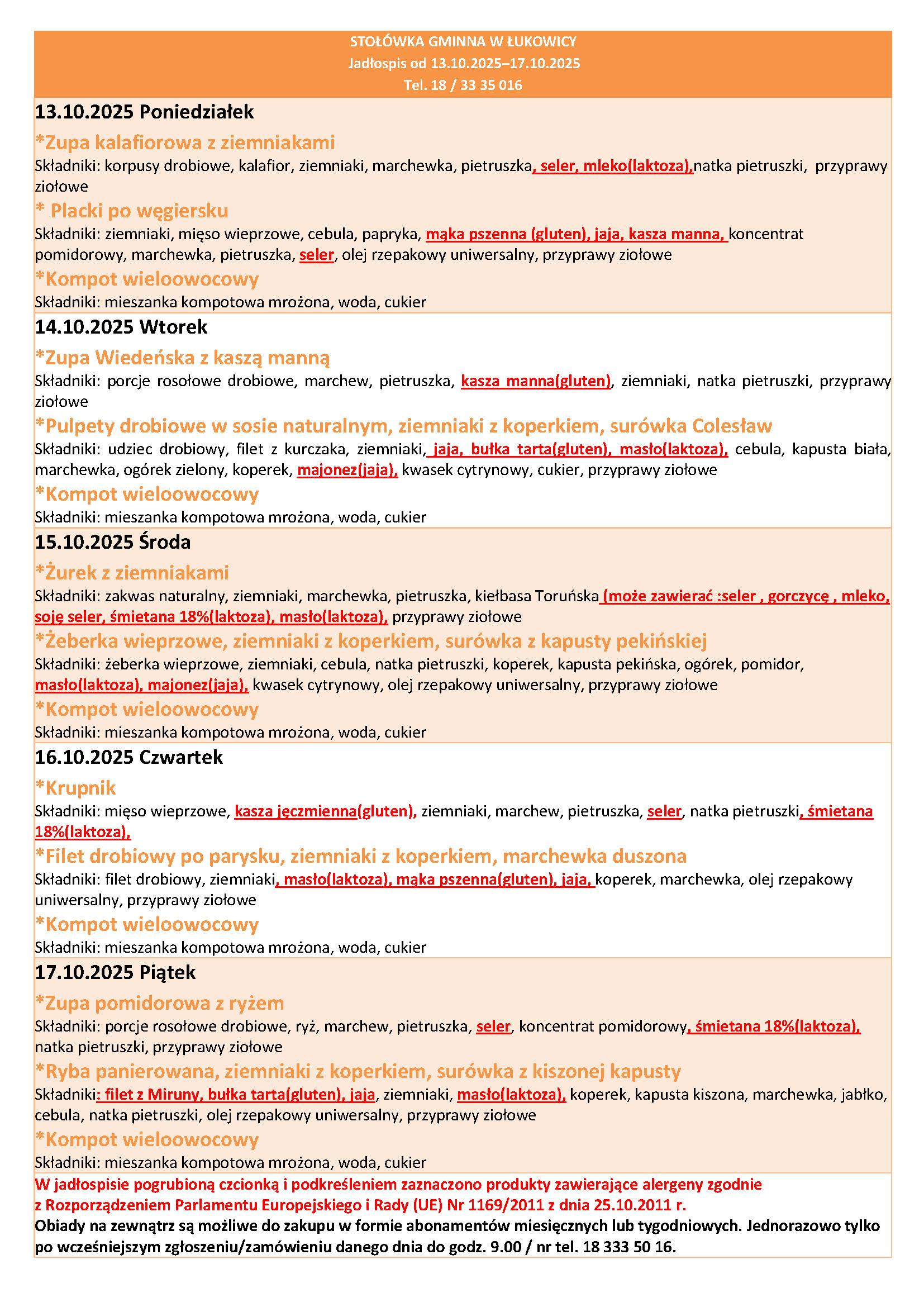 Zakup jednorazowego obiadu tylko po wcześniejszym zgłoszeniu/zamówieniu danego dnia do godz. 9.00 na nr tel: 18 333 50 16.
