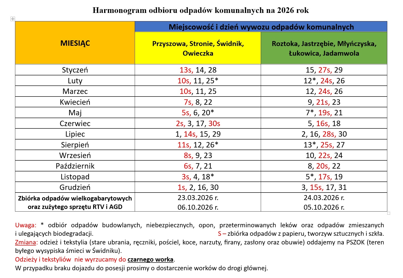 Poniżej prezentujemy harmonogram odbioru odpadów komunalnych na 2026 rok.