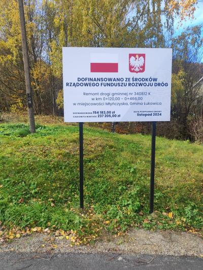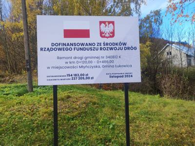 Wartość wykonanego remontu wynosi 237 205,00 zł. Zadanie zostało realizowane przy udziale dofinansowania w ramach Rządowego Funduszu Rozwoju Dróg - edycja 2024 (nabór uzupełniający) w wysokości: 154 183,00 zł (65%), wkład własny Gminy Łukowica wynosi: 83 022,00 zł (35%).